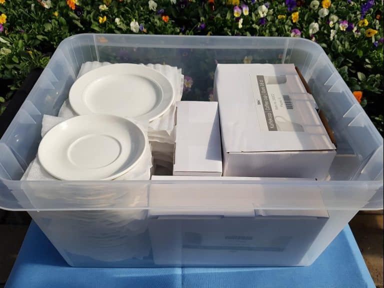 Kahvikuppi 1,8 dl + asetti, kakkulautanen, lusikka. Setit vuokrataan kokonaisina laatikoina ja yksi laatikko sisältää 22 kpl kahvikuppisettejä. Laatikoita on 3 kpl (66 henkilölle)